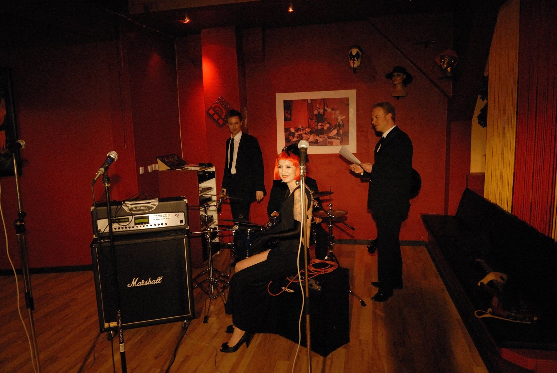 A very special experience was the shoot for "Love Bizarre" The whole idea was to show a band in evening dresses who play their programm verry straight on a stage in a club..... while everything around them sinks into a wild orgy.