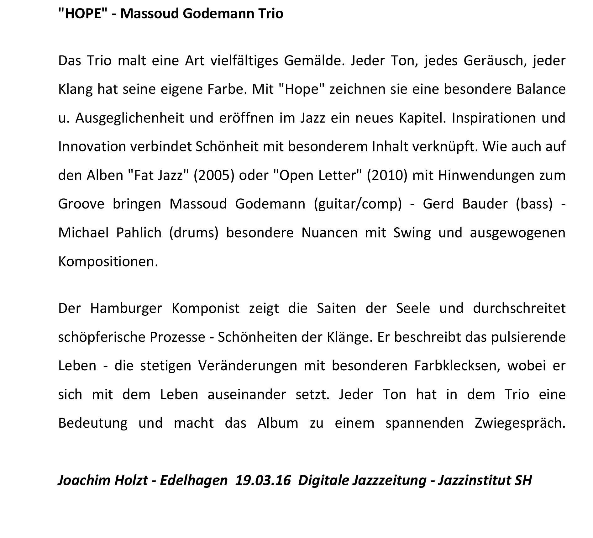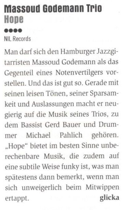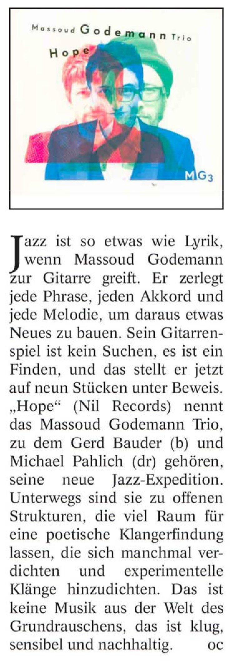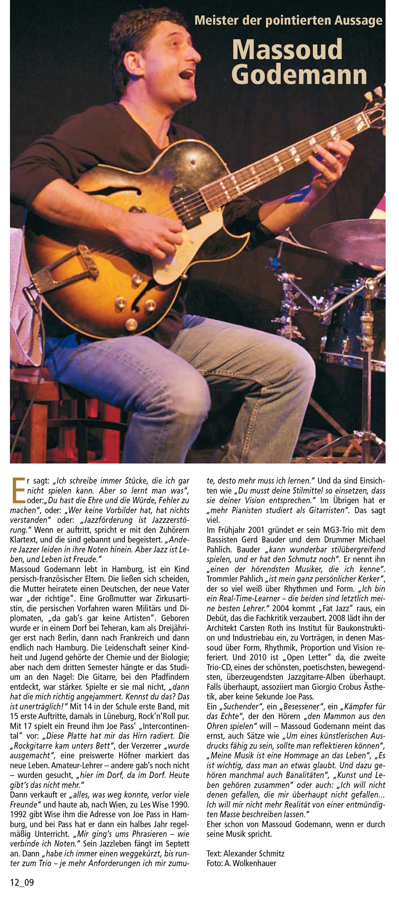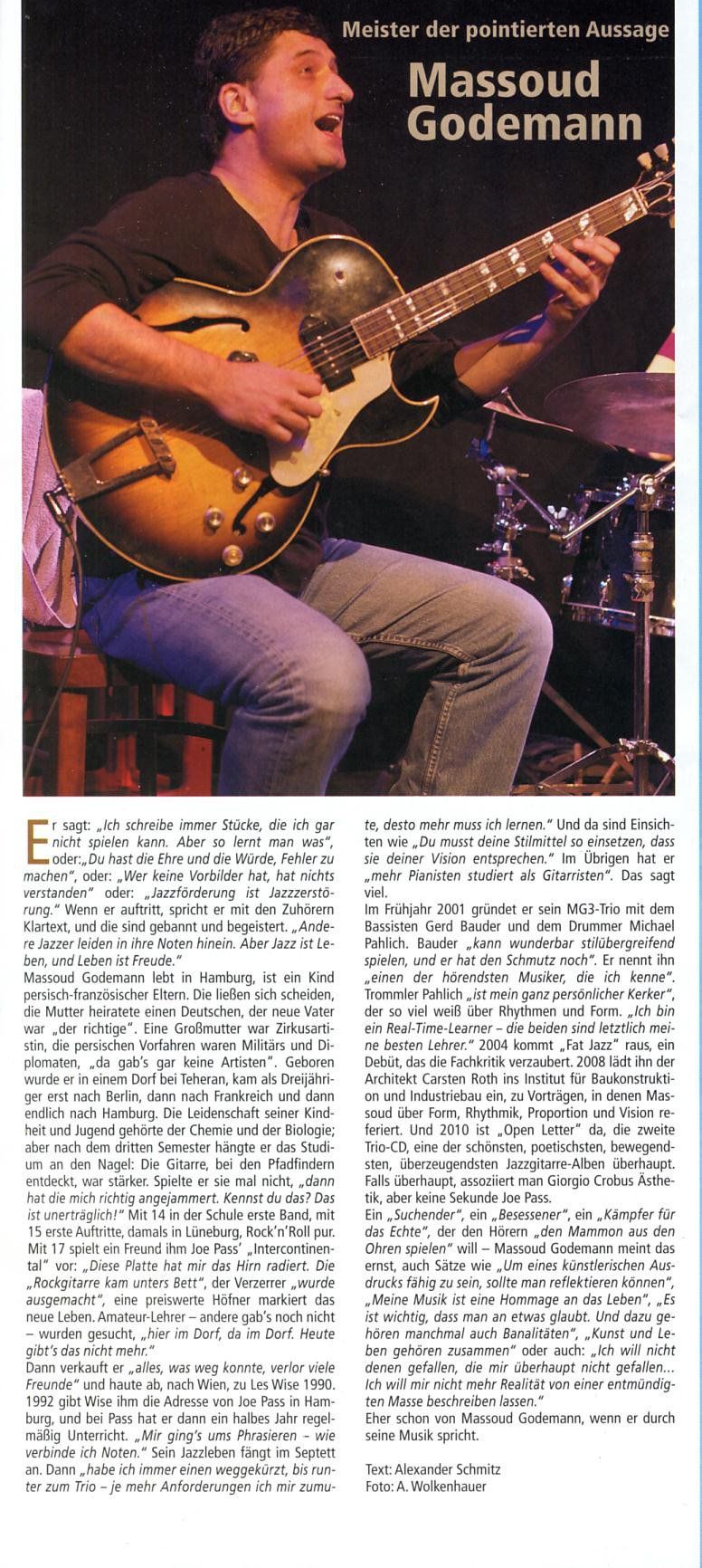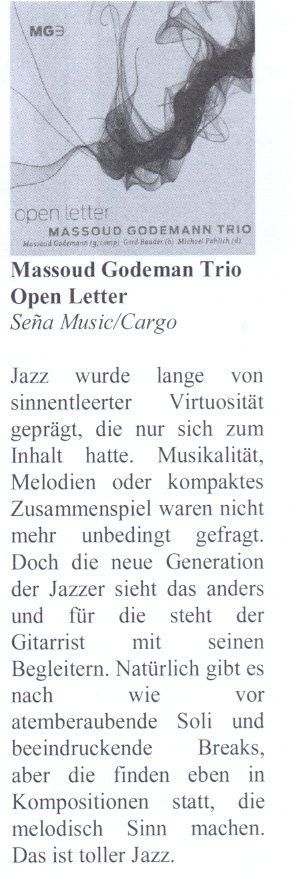 "Jazz is life and life is joy. My music is a tribute to life, "says Massoud Godemann, who recorded 2010 with Open Letter" one of the most beautiful, poetic, moving, convincing jazz guitar albums ever "(Jazzpodium Nov / Dec 2012).