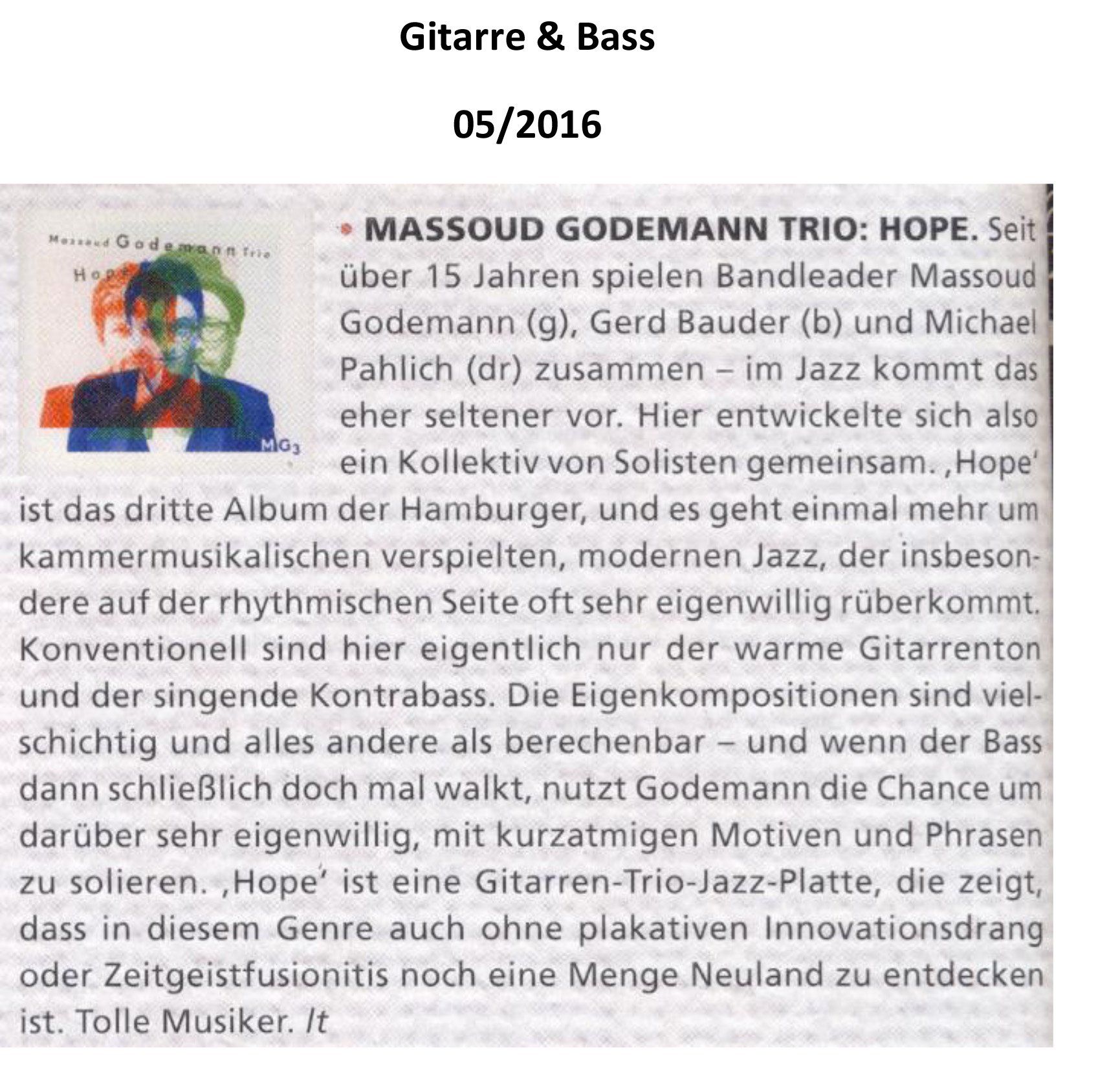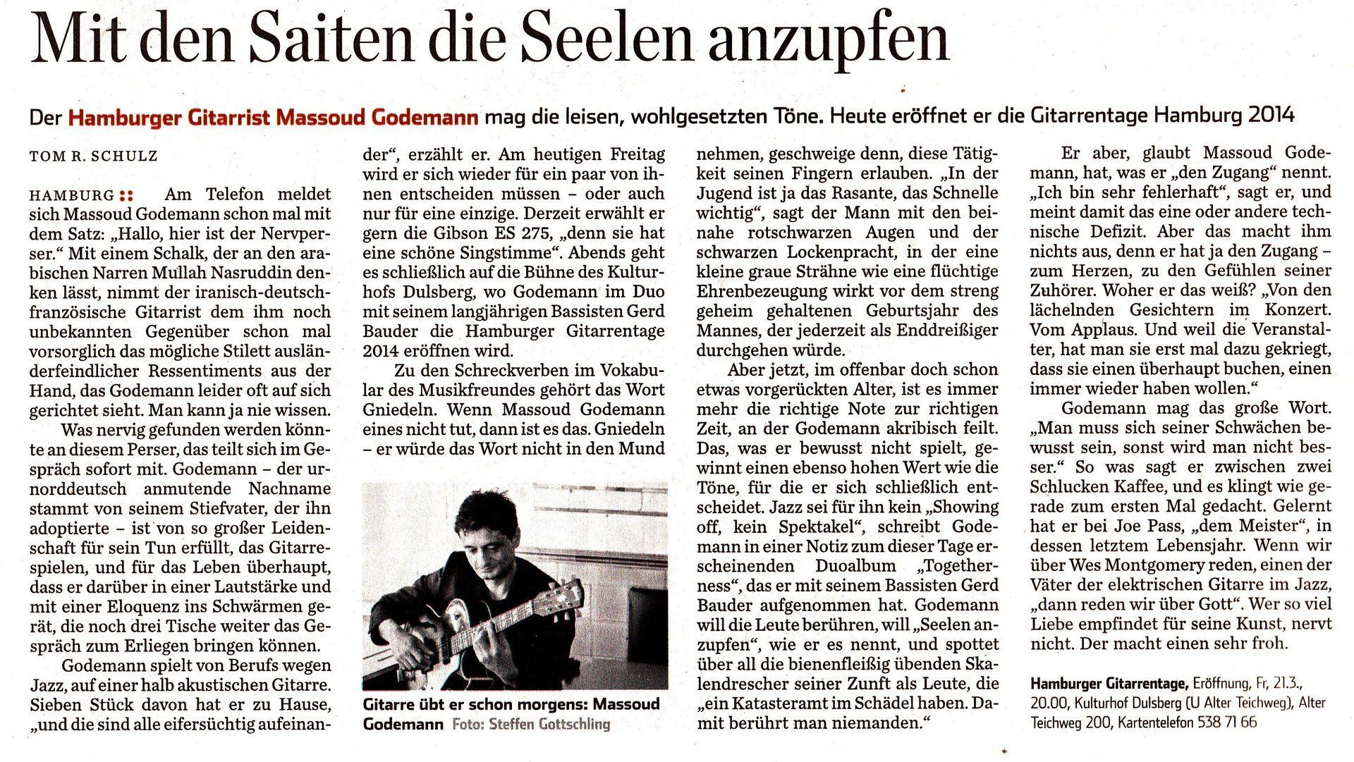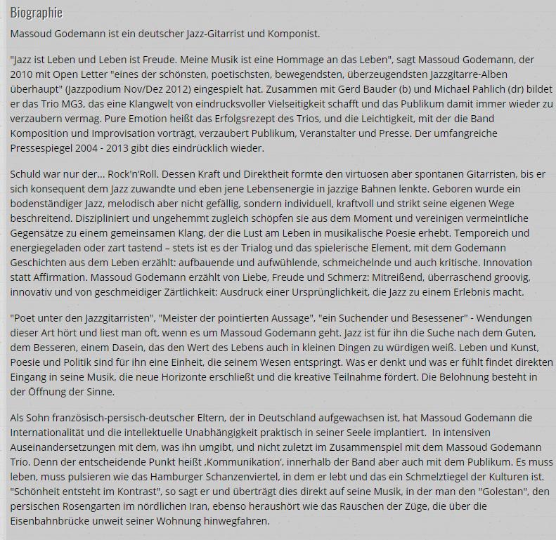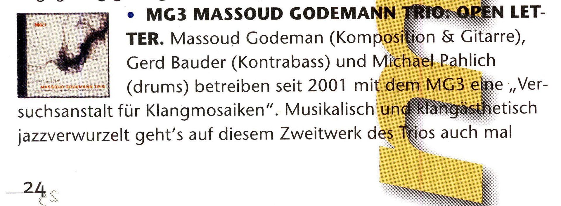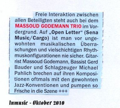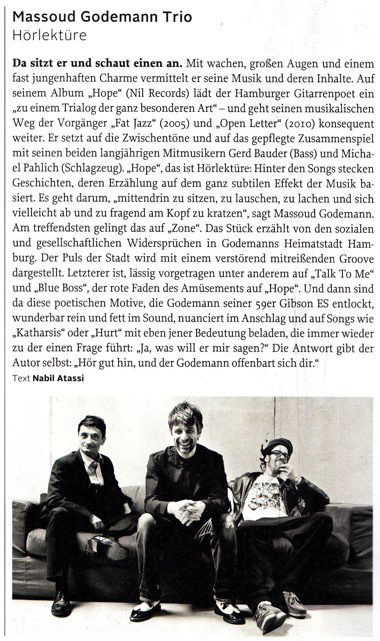 "Jazz is life and life is joy. My music is a tribute to life, "says Massoud Godemann, who recorded 2010 with Open Letter" one of the most beautiful, poetic, moving, convincing jazz guitar albums ever "(Jazzpodium Nov / Dec 2012).