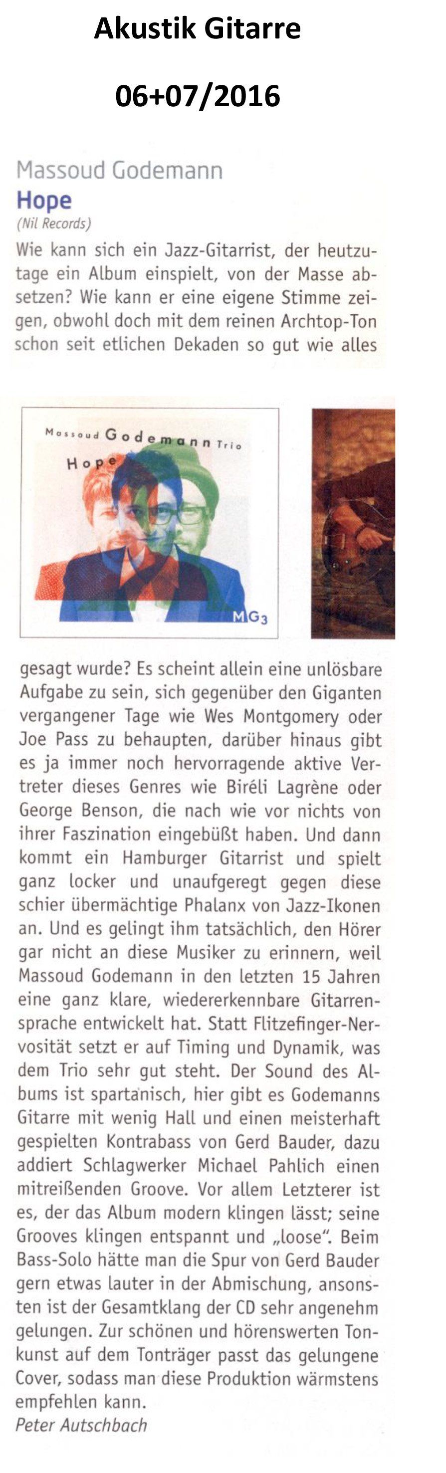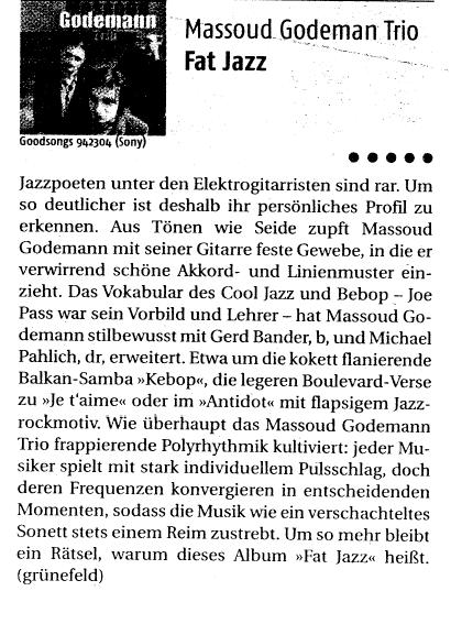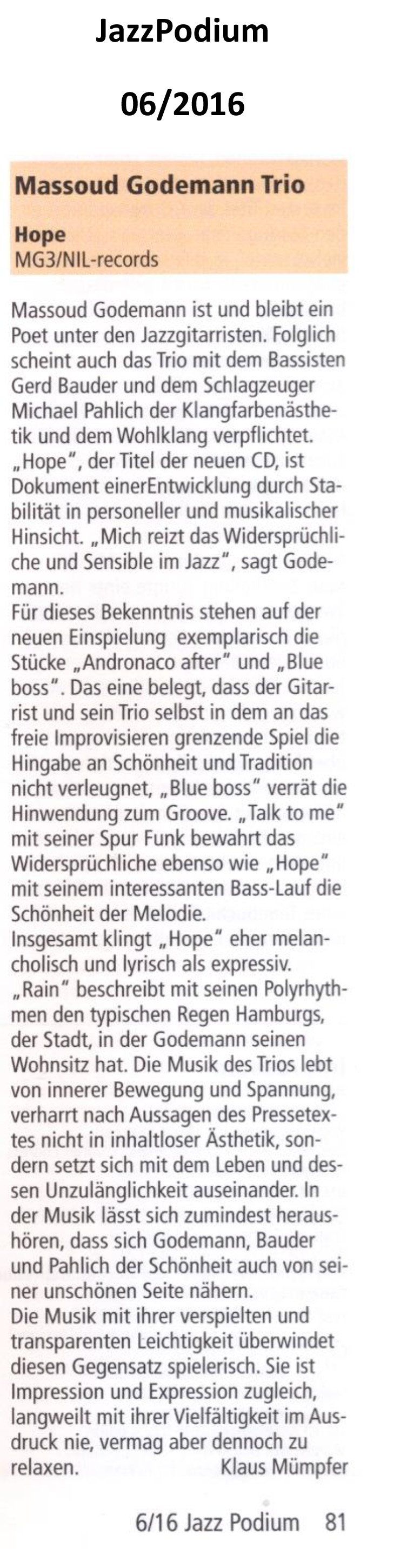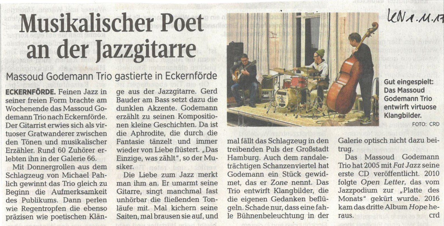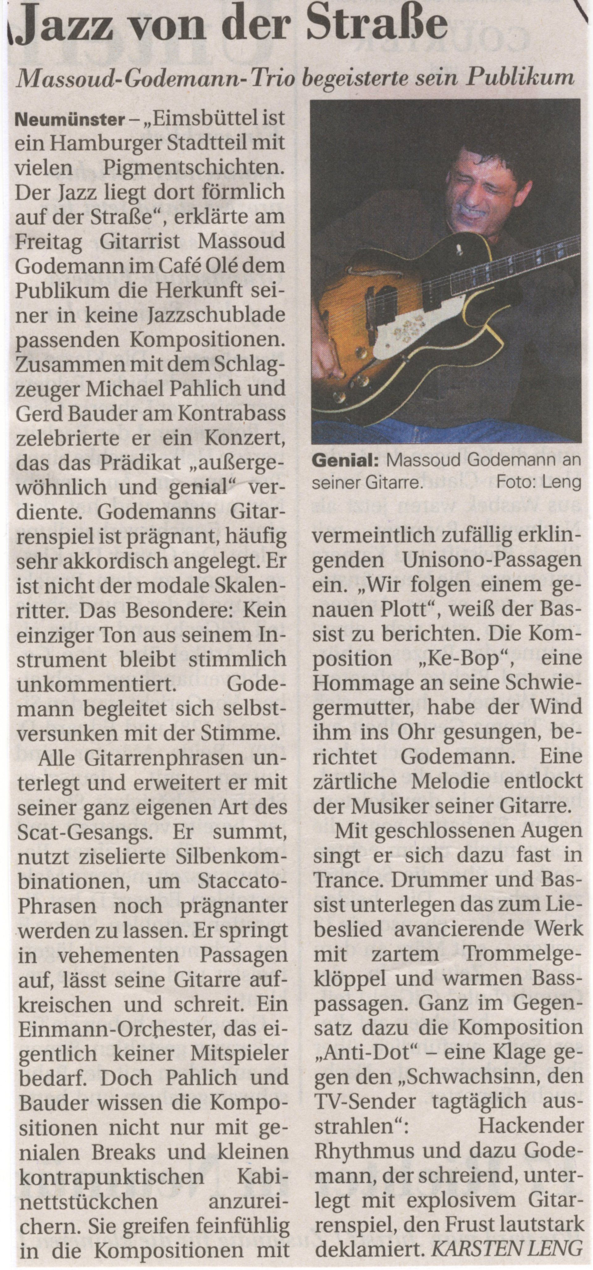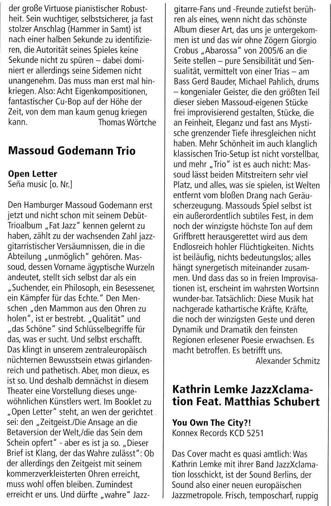"Jazz is life and life is joy. My music is a tribute to life, "says Massoud Godemann, who recorded 2010 with Open Letter" one of the most beautiful, poetic, moving, convincing jazz guitar albums ever "(Jazzpodium Nov / Dec 2012).