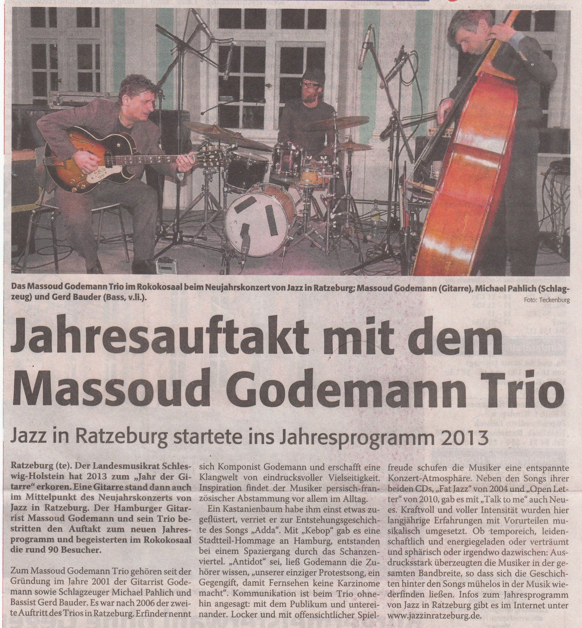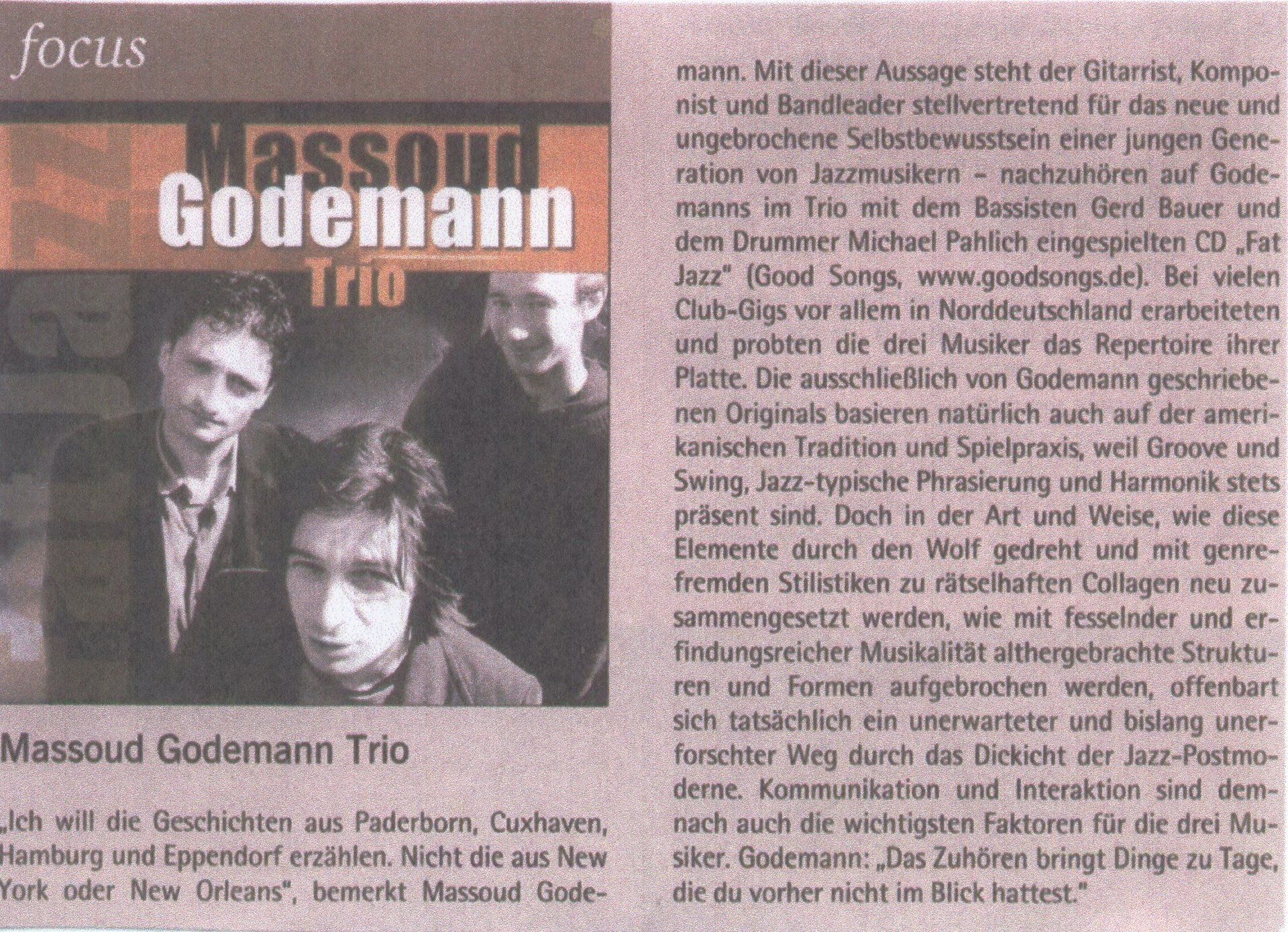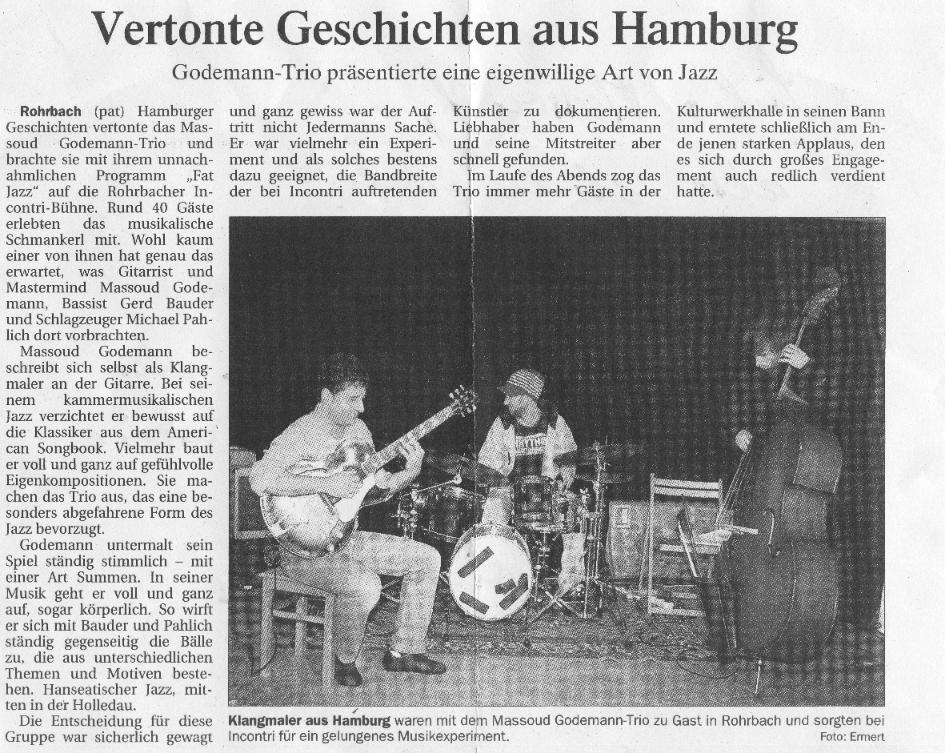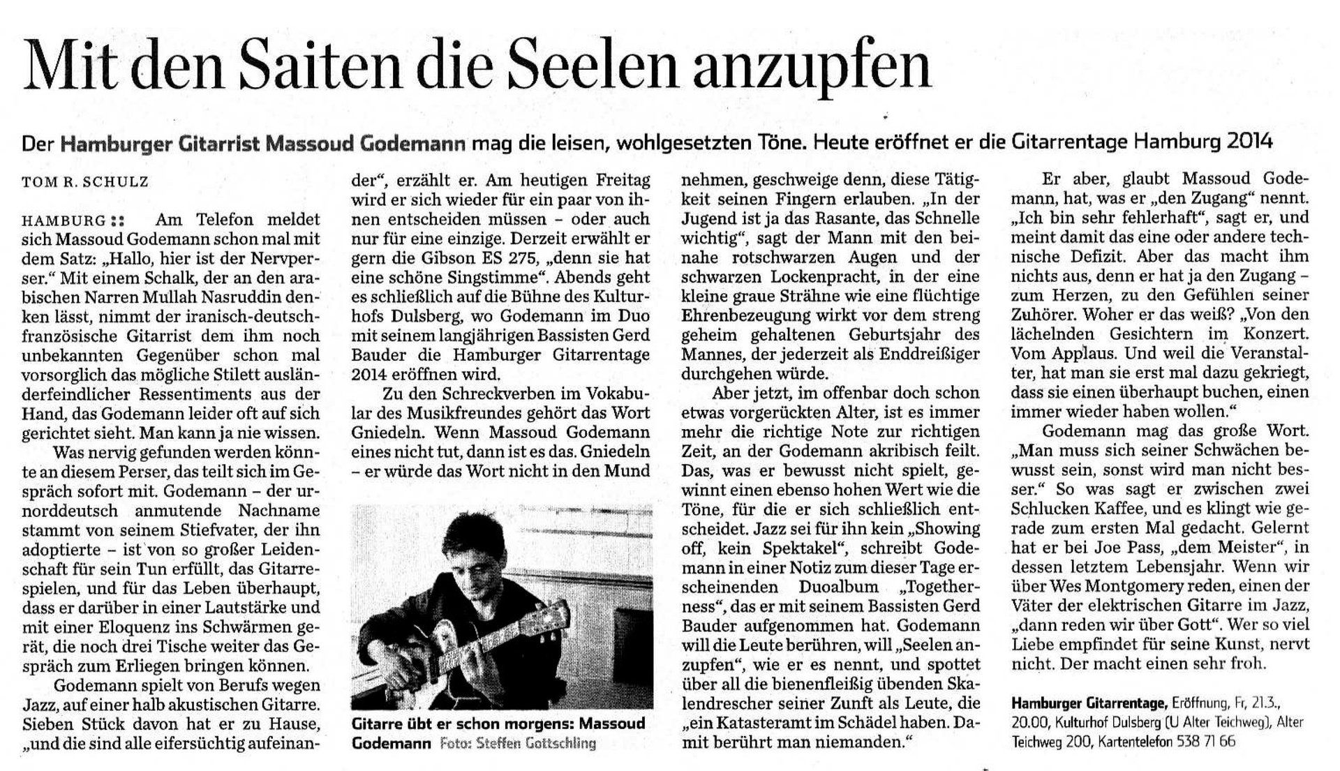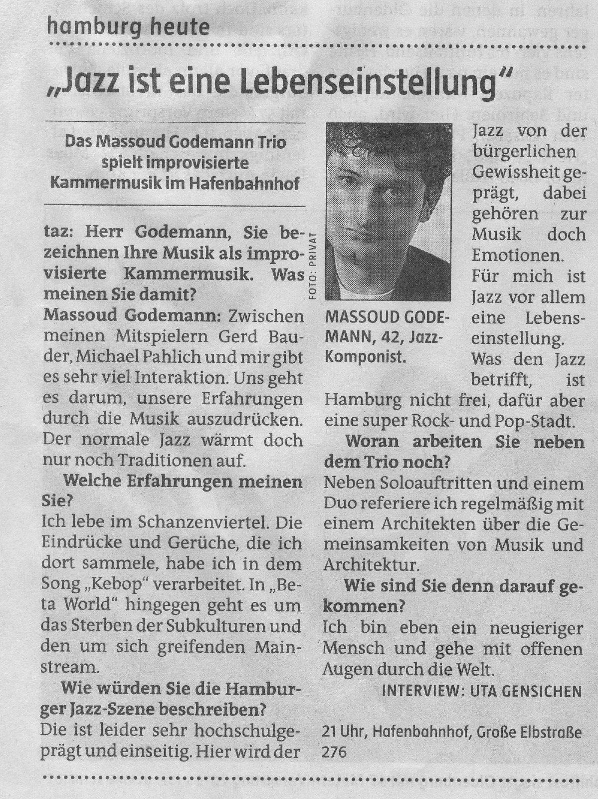 "Jazz is life and life is joy. My music is a tribute to life, "says Massoud Godemann, who recorded 2010 with Open Letter" one of the most beautiful, poetic, moving, convincing jazz guitar albums ever "(Jazzpodium Nov / Dec 2012).